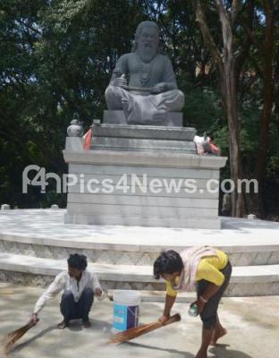 Workers seen cleaning and preparing the Poet Valmiki statue, which is to be inaugurated tomorrow at Legislative House on the occasion of Valmiki Jayanti , in Bengaluru on Wednesday 4th October 2017