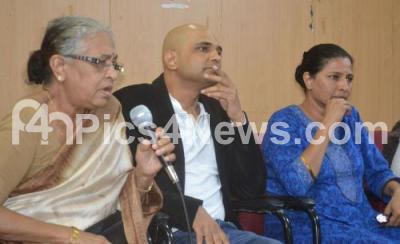 Photo Caption : Indira Lankesh, mother of late Gauri Lankesh with Indrajit Lankesh, brother and Kavitha Lankesh, sister, seen addressing a press conference regarding the murder case of Gauri Lankesh at Press Club, in Bengaluru on Thursday 5th October 2017