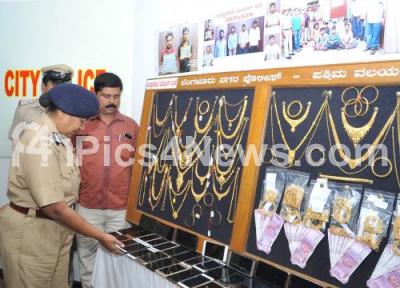 Photo Caption : Malini Krishnamoorthy, IPS, Additional Commissioner of Police inspecting the recovered jewels, cash and mobiles which were seized from the accused during a press conference at Police Commissioner Office, in Bengaluru on Friday 6th October 2017