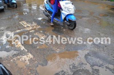 Photo Caption : Crater like potholes are still creating problems to the motorists at Magadi Road, in Bengaluru on Friday 6th October 2017