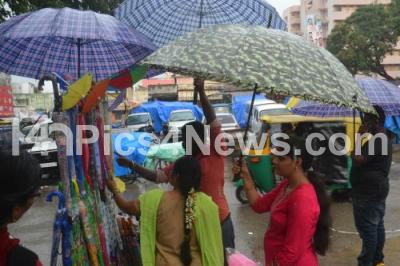 Photo Caption : People seen buying umbrellas at Shivajinagar, as heavy rains continued to lash Bengaluru City, in Bengaluru on Friday 6th October 2017
