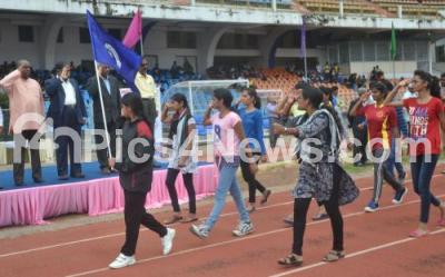 Photo Caption : Dr BK Ravi, Registrar, Bangalore University with Dr A Lokesh, Finance Office, Bangalore University and others reviewing the march past of the Athletes during the 53rd Annual Inter Collegiate Athletic Meet 2017 and 2018 at Kanteerva Stadium, organised by Bangalore University , in Bengaluru on Tuesday 10th October 2017