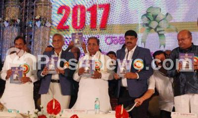 Photo Caption : CM Siddarammaiah with Ministers KJ George and HM Revanna, Krishna Reddy, president and Kempanna, General Secretary Karnataka state Contractors Associations and others seen releasing the Karnataka state Contractors Associations 2017 souvenir during the Karnataka state Contractors Associations Conference at Palace Ground, in Bengaluru on Tuesday 10th October 2017