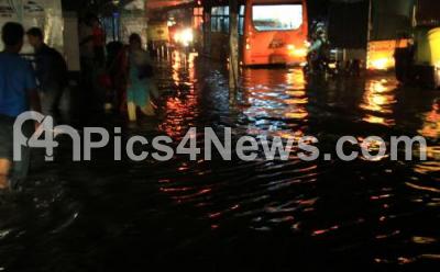 Photo Caption : Waterlogged road at Basaveshwara Nagar after heavy downpour in the city, 3 people washed away in the storm water and two people killed after a house wall collapsed, in Bengaluru on Friday 13th October 2017