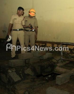 Event Description : Fire brigade personnel searching at the spot where 35 year old Priest Vasudev, who was washed away in the storm water at Kurubarahalli, in Bengaluru on Friday 13th October 2017