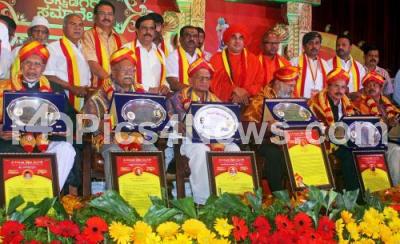 Photo Caption : Narayana Gowda, President Karnataka Rakshan Vedike with Dr Manu Baligar, President Kannada Sahitya Parishat, Sri Jaya Mruthyunjaya Swamiji and others presented awards to senior writers and artistes during the Kannada Conference at Palace Grounds, in Bengaluru on Saturday 14th October 2017
