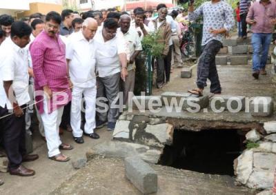 Photo Caption : BS Yeddyurappa and BJP leaders visited the spot where priest Vasudev was washed away in last night heavy rainfall at Kurubarahalli, in Bengaluru on Saturday 14th October 2017