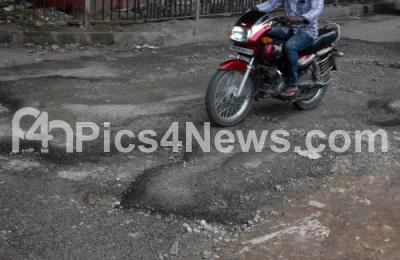 Photo Caption : Pothole road at Hennur Main Road causing problems to motorists, in Bengaluru on Sunday 15th October 2017