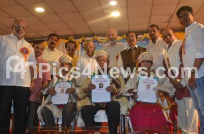 Photo Caption : P Jayaram Bhat presented Karavali Ratna Award to Justice Santhosh Hegde with Dr Lakshmi G Prasad and TN Raghavendra Rao during a program at Ajantha Hotel, MG Road, organized by Dakshina Kannadigara Sangha, in Bengaluru on Sunday 15th October 2017
