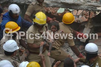 Photo Caption : A 2 year old baby survived and was rescued after the rescue workers removed the debris to look for survivors at the site of a building that collapsed in Ejipura due to cooking gas cylinder explosion in the residential building , in which 7 people died, in Bengaluru on Monday 16th October 2017