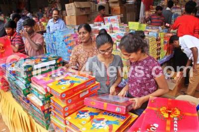 Photo Caption : People buying crackers on the eve of Diwali Festival near Ram Mandir, Rajajinagar, in Bengaluru on Tuesday 17th October 2017