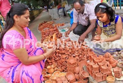Photo Caption : People buying Diwali Lamps on the eve of Diwali Festival near Ram Mandir, Rajajinagar, in Bengaluru on Tuesday 17th October 2017