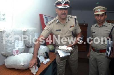 Photo Caption : Additional Commissioner of Police Seemanth Kumar and DCP Boralingaiah inspecting the seized Ganja worth 7 lakhs, which were being peddled to students at Koramangala, during a press conference at police Commissioner of office, in Bengaluru on Thursday 19th October 2017