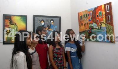 Photo Caption : College students admiring the “VIVID PAINTING EXHIBITION 2017†of Aditi B Bommai and Shreya Mittal at Chitrakala Parishat, in Bengaluru on Thursday 19th October 2017