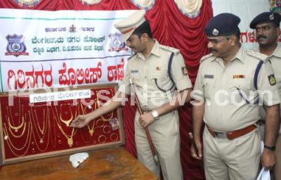 Photo Caption : DCP Sharanappa with ACP Mahanta Reddy inspecting recovered jewels and pistol during property parade of Bangalore South, in Bangalore on Saturday 21st October 2017
