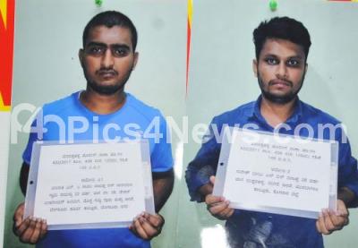 Photo Caption : File photos of the accused and bank staff Maruthi and Suresh, were arrested in a cheating case of JP Morgan Bank and recovered cash and Jewellery, being displayed during the press conference at Bangalore City Police Commissioner Office, in Bengaluru on Monday 23rd October 2017