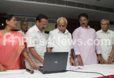 Photo Caption : BS Yeddyurappa, BJP State President with Union Minister DV Sadananda Gowda, R Ashok,MLA, MP Shobha Karandlaje and others inaugurated the logo for the upcoming BJP Parivarthana Yatra at Hotel Parag, in Bengaluru on Monday 23rd October 2017