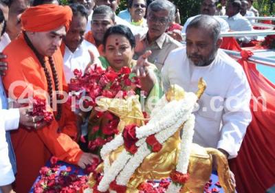 Photo Caption : Minister Umashree with Former Minister Murugesh Nirani, Artist Nagaraj and others floral tribute to the statue of birth anniversary of Kittur Rani Chennamma at Town Hall, in Bengaluru on Monday 23rd October 2017