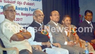 Photo Caption : Dr H Sudarshan, Secretary, VGKK and Karuna Trust, BR Hills with Dr Gururaj Karajagi, CMD, Academy for Creative Teaching, Dr A R K Pillai, Founder President, IDF and Sadhana Kaikeni at the IDF Grants and Awards Function 2017 at Bharatiya Vidya Bhavan, organized by Indian Development Foundation, in Bengaluru on Thursday 26th October 2017