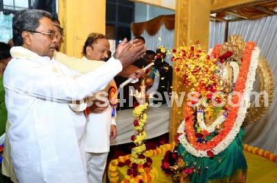 Photo Caption : Chief Minister of Karnataka Siddaramaiah with Ministers Roshan Baig and Tanveer Sait offering floral tribute to goddess Bhuvaneshwari during the 62nd Kannada Rajyotsava Day (Karnataka State Formation day) program at Kanteerava Stadium, in Bengaluru on Wednesday 1st November 2017