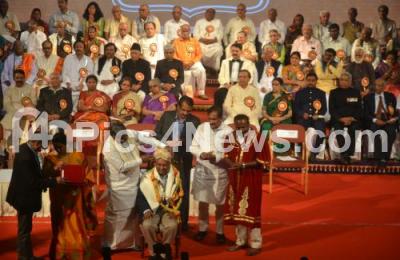 Photo Caption : CM Siddaramaiah with Ministers Umashree and KJ George, BBMP Mayor Samapath Raj and others seen presenting Kannada Rajyotsava Award to Former Justice Nagamohan Das during the Kannada Rajyotsava Awards presentation program at Ravindra Kalakshetra, in Bengaluru on Wednesday 1st November 2017