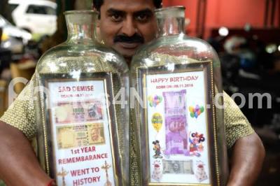 Photo Caption : Bottle Artist Basavraj showing his bottle art of one year of the demonetization of Indian currency notes of Rs 500 and Rs 1000 at Press Club, in Bengaluru on Tuesday 7th November 2017