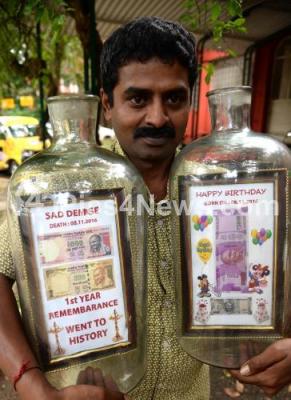 Photo Caption : Bottle Artist Basavraj showing his bottle art of one year of the demonetization of Indian currency notes of Rs 500 and Rs 1000 at Press Club, in Bengaluru on Tuesday 7th November 2017