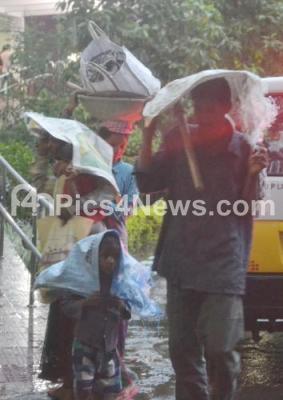 Construction labours seen covering their heads with construction material at Bengaluru City Railway Station, as rains lashed Bengaluru City, on Tuesday 7th November 2017