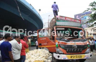 Event Description : A container van carrying hundreds of chickens fell from the top of the Yeshwanthpur Flyover due to drivers negligent driving, killing all the chickens and 3 people have been seriously injured, in Bengaluru on Friday 17th November 2017