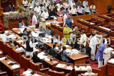 Photo Caption : Opposition party MLCs arguing during council Session at Suvarna Soudha, in Belagavi on Monday 20th November 2017