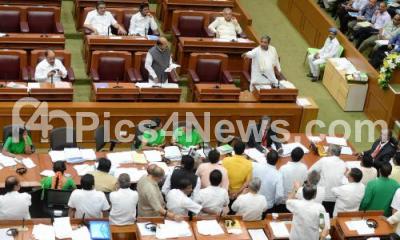 Photo Caption : CM Siddaramaiah arguing with opposition party MLAs during Assembly session at Suvarna Soudha, in Belagav onTuesday 21st November of 2017