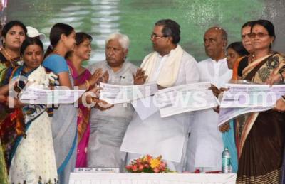 Photo Caption : CM Siddaramaiah with Ministers DK Shivakumar, HK Patil and others inaugurated various development projects and distributed benefits to various department beneficiaries at Naragund on Monday 27th November 2017