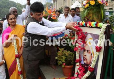 Event Description : Minister DK Shivakumar with K Ratna Prabha, IAS, Karnataka Chief Secretary, floral tribute to the portrait of Kengal Hanumanthaiah, on his 37th Death Anniversary at Vidhan Soudha, in Bengaluru on Friday 1st December 2017