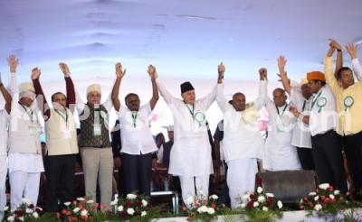 Photo Caption : Farooq Abdullah seen with HD Devegowda and HD Kumarswamy and other JDS leaders at the JDS minority Conference in Tumkur on Sunday 10th December 2017