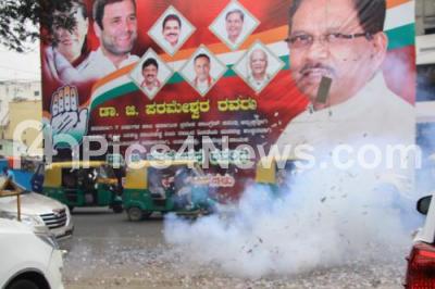 Photo Caption : Congress supporters busting crackers to celebrate Rahul Gandhi being elected as AICC President at KPCC, in Bengaluru on Tuesday 12th December 2017
