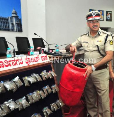 Photo Caption : ACP Seemant Kumar Singh inspecting seized cylinders in which ganja packets were found, being displayed during a press conference at Police Commissioner Office, in Bengaluru on Tuesday 12th December 2017