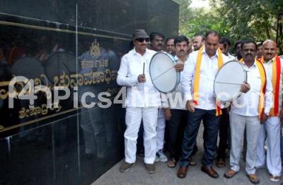 Event Description : Members of Kannada Okkuta Karnataka Rajya and its President Vatal Nagaraj protesting by beating the drums to fulfill their demands in front of Election Commissioners Office at Seshadri Road, in Bengaluru on Thursday 14th December 2017