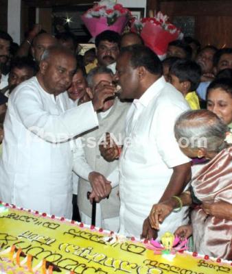 Photo Caption : JDS State President H D Kumarswamy celebrating his 59th birth day with his parents HD Devegowda and with his supporters at Padmanaba Nagar, in Bengaluru on Saturday 16th December 2017