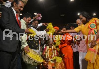 Photo Caption : Saalumarada Thimmakka being showered and honored with flowers as she was felicitated by Minister H Anjaneya, HS Doreswamy and others during the Salumarada Thimmakka National Greenery Awards program at Ambedkar Bhavan, in Bengaluru on Saturday 16th December 2017