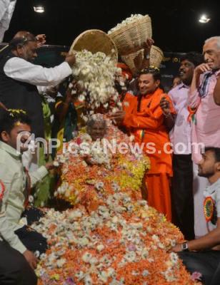 Saalumarada Thimmakka being showered and honored with flowers as she was felicitated by Minister H Anjaneya, HS Doreswamy and others during the Salumarada Thimmakka National Greenery Awards program at Ambedkar Bhavan, in Bengaluru on Saturday 16th December 2017