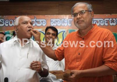 Photo Caption : BJP State president BS Yeddyurappa with MLA Suresh Kumar seen celebrating with sweets after the Gujarat and Himachal Pradesh election results were announced at BJP Office, Malleshwaram, in Bengaluru on Monday 18th December 2017