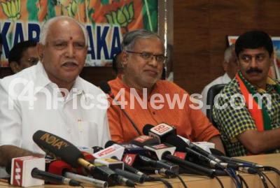 Photo Caption : BJP State president BS Yeddyurappa with MLAs Suresh Kumar and Narayanswamy, addressing a press conference after the Gujarat and Himachal Pradesh election results were announced at BJP Office, Malleshwaram, in Bengaluru on Monday 18th December 2017