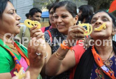 Photo Caption : BJP supporters seen celebrating with sweets after the Gujarat and Himachal Pradesh election results were announced at BJP Office, Malleshwaram, in Bengaluru on Monday 18th December 2017