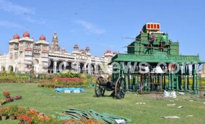Photo Caption : Preparations for the Grand Flower Show underway at Mysore Palace, as part of the Mysuru Winter Festival 2017 in Mysuru on Friday 22nd December 2017