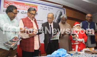 Photo Caption : N R Narayana Murthy, Founder of Infosys with Former CM S M Krishna, Aravinda Malagatti, President, Karnataka Sahitya Academy releasing "Samajamuki" magazine at Gandhi Bhavan, in Bengaluru on Monday 25th December 2017