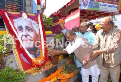 Photo Caption : Prof S G Siddaramaiah, Chairman, Kannada Development Authority, Nagaraj Murthy and others offering floral tribute to Rastra Kavi (National Poet) Kuvempu portrait on his 113th birth anniversary at Freedom Park, in Bengaluru on Friday 29th December 2017