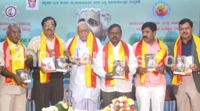 Photo Caption : Freedom Fighter H S Doreswamy with Dr. Manu Baligar, President, Kannada Sahitya Parishat, Dr L Hanumantaiah, M Thimmaiah, Mayanna and others releasing books during birth anniversary of Rastra Kavi (National Poet) Kuvempu portrait at Kannada Sahitya Parishat, in Bengaluru on Friday 29th December 2017