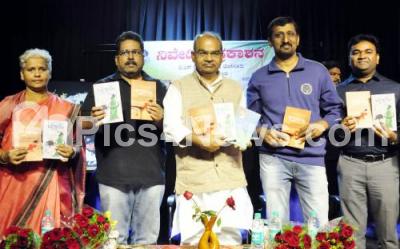 Photo Caption : S G Siddaramaiah, President, Kannada Development Authority releasing “Tyresamy†book with Writers Dr H L Pushpa, Jogi, Book Author Bhimanahalli Ramesh Babu at Indian Institute of World Culture, in Bengaluru on Sunday 31st December 2017