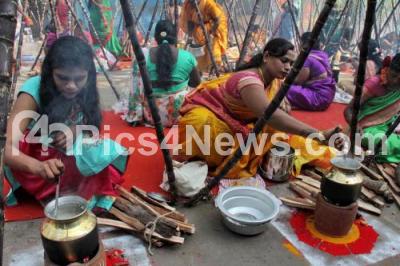 Photo Caption : Residents of Kalasipalyam preparing Pongal during Sankranti Sambrama organized by ward councilor Pratibha Dhanraj, in Bengaluru on Sunday 7th January 2018