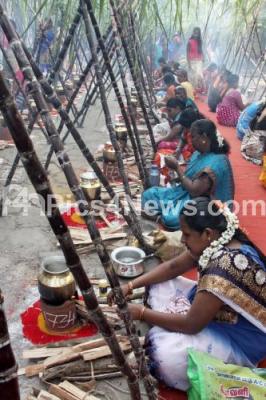 Photo Caption : Residents of Kalasipalyam preparing Pongal during Sankranti Sambrama organized by ward councilor Pratibha Dhanraj, in Bengaluru on Sunday 7th January 2018